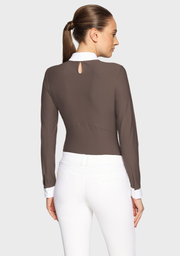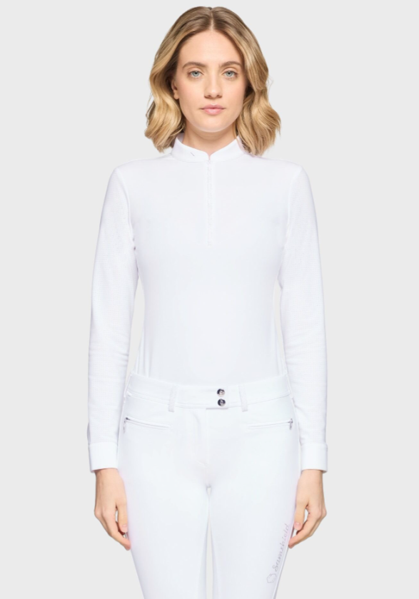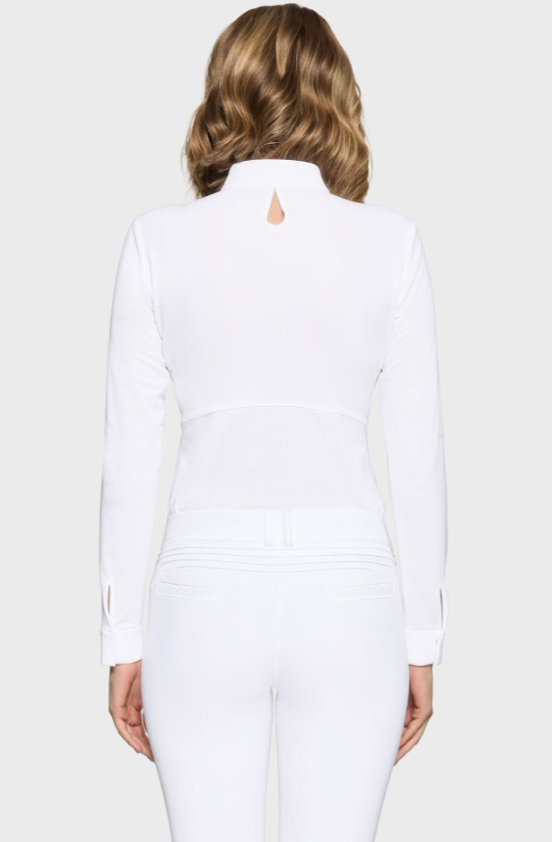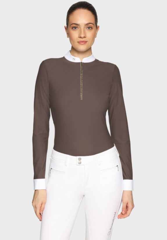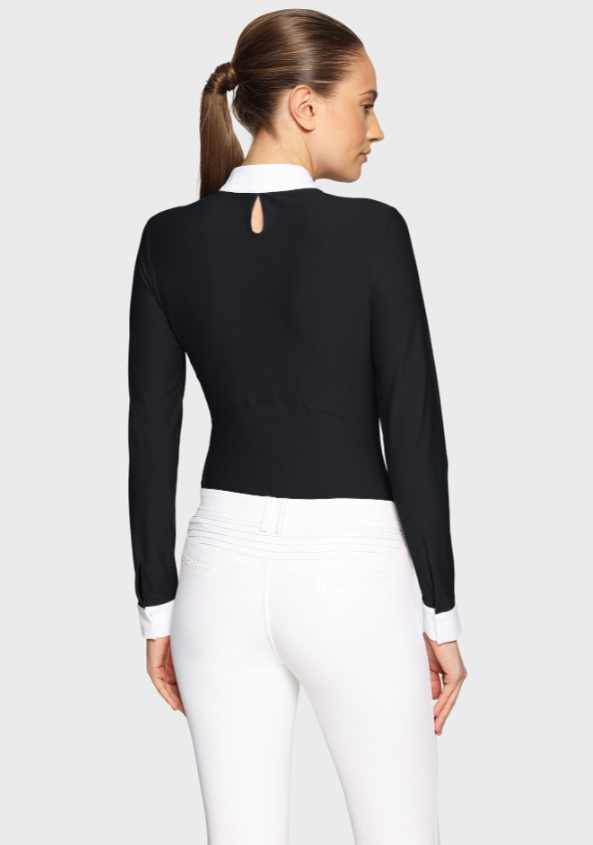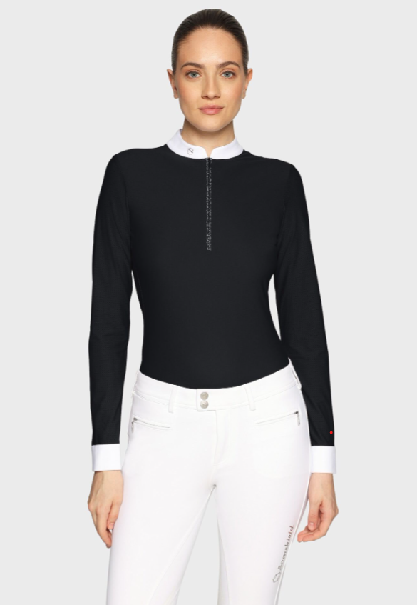 En af de meget populære stævnebluser fra Samshield med lynlås i halsen og smuk crystal fabric pynt. Hvid krave og manchetter, så dette er en stævnebluse men i de farvede varianter er det også en fin træningsbluse, til dage hvor man gerne vil shine lidt ekstra. Samshields stævnebluser er i det lækreste materiale- strækbart og åndbart og virkelig behageligt at have på. Dette er en del af SS26 kollektionen, så der er begrænset antal.