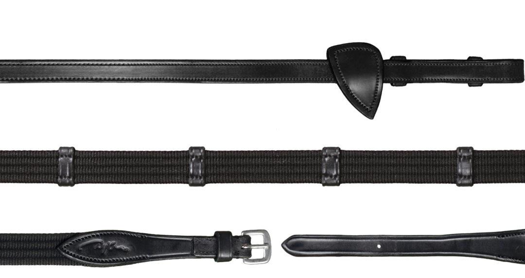 Dyon New English stoftøjler med stoppere i bredden 5/8". Læderdelen af tøjlen er flad og af engelsk læder, hvori syningerne er tone-i-tone med læderet, og spænderne i tøjlen er i rustfrit stål.