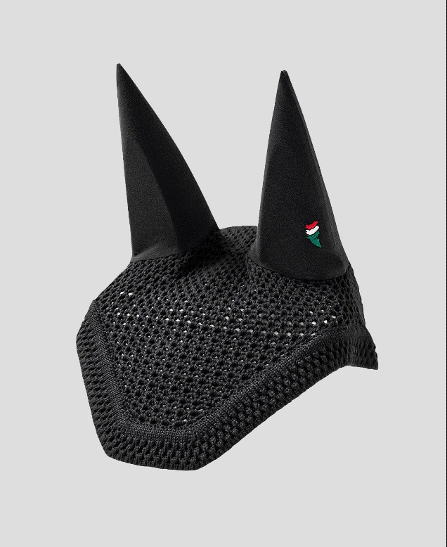 Klassisk hut fra italienske Equiline. Denne hut har logo på venstre øre og er udformet med lige kant over panden. Klassisk look til stævner eller til brug til hverdag hvis hesten har brug for beskyttelse om ørene. Materialet ørerne er udformet af er elastisk.