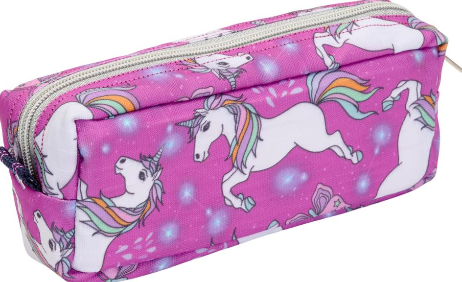 Penalhus med ét rum, der lukkes med lynlås. Farverigt enhjørningedesign til at opbevare blyanter, farver eller måske hårting til ridestævner?