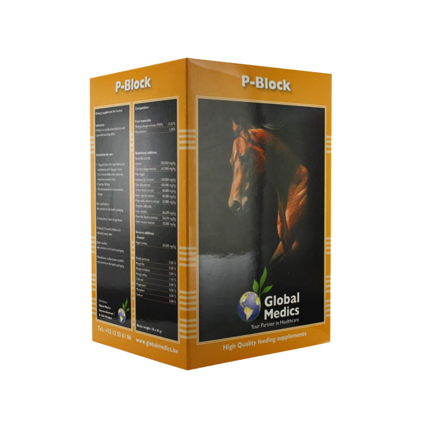 P-Block fra Global Medics anvendes som et supplement i foderet for eksempel til heste der skal præstere meget for eksempel til konkurrencer eller hvis de har været på en lang transport eller skal i vet-tjek til et stævne. P-Block er et pulver som anvendes som anvendes som let smertestillende til hesten. P-Block fra Global Medics er fremstillet af planter med kraftige antioxidanter i og det har en smertestillende effekt på hesten. De fleste heste kan have spændinger og ømheder i forbindelse med stævner og P-Block fra Global Medics bliver anvendt af mange topryttere fordi det er et naturligt og dopingfrit middel til at lindre ømhed og smerte hos hesten. På den måde kan P-Block fra Global Medics hjælpe til en bedre præstation hos top sportshesten på en naturlig måde.