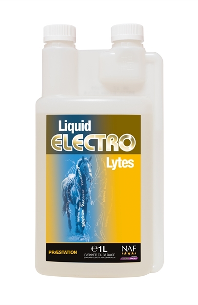 NAF flydende elektrolytter til heste er elektrolytter af høj kvalitet. Elektrolytter gives som tilskud til foder i forbindelse med træning eller varmt vejr. Når hesten sveder gavner det den at få elektrolytter efter arbejdet. Det er også en god idet at give det inden. Ved længere rejser kan elektrolytter også med fordel gives. Disse elektrolytter fra NAF er flydende, og det betyder, at de kan sprøjtes direkte ind i munden på hesten, hvis der er særligt behov for det. NAF flydende elektrolytter kan gives direkte i foderet, sprøjtes ind i hestens mund eller tilsættes vand. Sælges i 1 liter flasker.