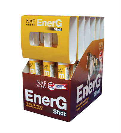 NAF EnerG Shot er en koncentreret, nærende blanding af essentielle aminosyrer og biotilgængeligt jern, der understøtter energistofskiftet, produktionen af røde blodlegemer og hjælper med at erstatte tab gennem sved.Nem at udfodre i en sprøjte og derfor ideel til stævner og træning. For daglig understøttelse af optimalt energistofskifte hos arbejdende heste, giv EnerG Flydende.
