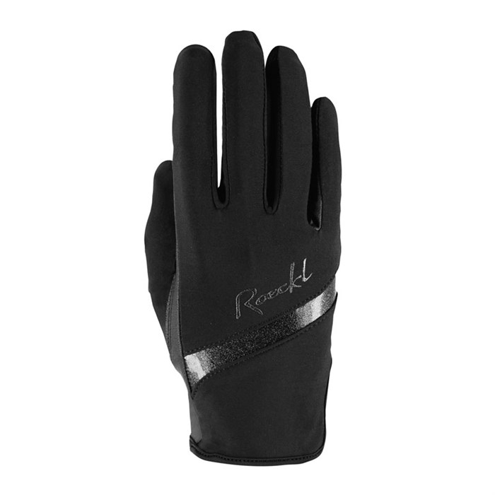 Roeckl Lorraine Ridehandske er en lækker og stretchy handske. Den øverste del af handsken er af et elastisk og åndbart materiale, og håndfladen er af Roeckls imiterede lædermateriale. Denne kombination giver handsken en fantastisk pasform, hvor den tilpasser sig hånden, samt et godt greb om tøjlen. Over håndryggen er handsken udsmykket med en stribe med glimmer og et glimtende Roeckl; en flashy detalje, der ikke er for meget. Samtidig har handsken touch-ID med de fleste smartphones.