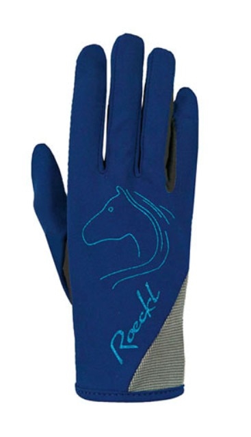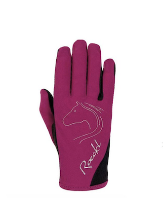 Roeckl Tryon ridehandske til børn. En tynd og behagelig ridehandske i lycra-materiale, der gør den både fleksibel og åndbar. Handskens håndflade er i et imiteret ruskindsmateriale, der giver et rigtig godt greb om tøjlen, og handsken lukkes med en lille velcrolukning på undersiden af håndleddet. Det fine glimmermotiv på handsken af en hest og Roeckl giver handsken et ekstra pift.