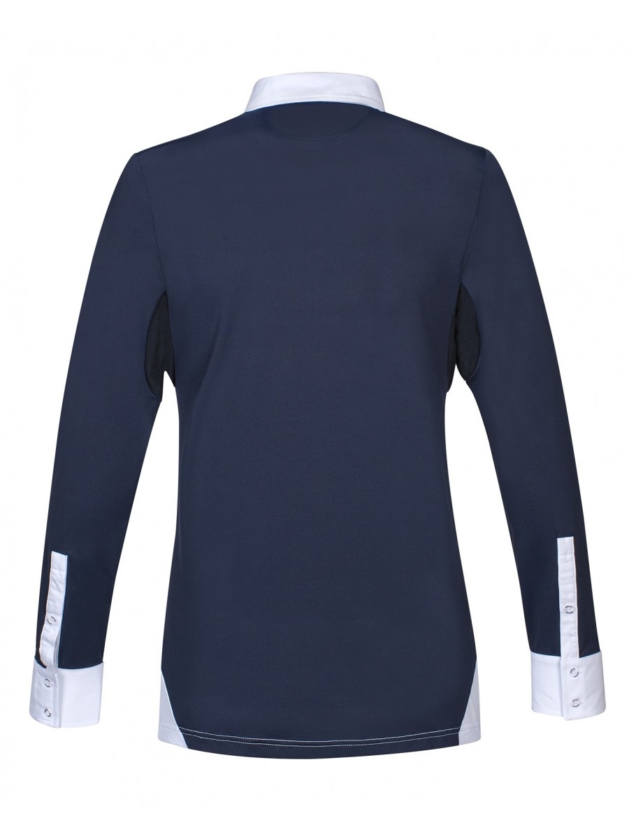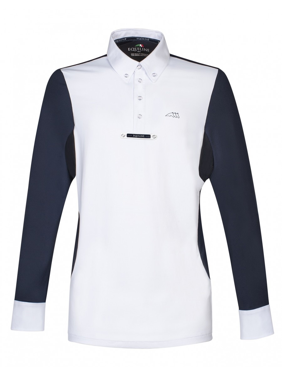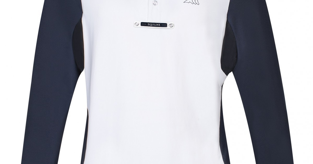 Equiline Opalite er en lækker stævnebluse til herren fra Equilines AW19 kollektion. Opalite har skjortelook med knapper øverst og botton-down. Der er slipseholder foran, som kan knappes af, så blusen også kan bruges til hverdagsridning. Blusen har hvid front men med mørk navy ærmer samt rygstykke. Der er mesh materiale under ærmerne - en meget behagelig bluse i teknologisk materiale som gør at den er behagelig at have på og den er svedtransporterende og hurtigt tørrende.