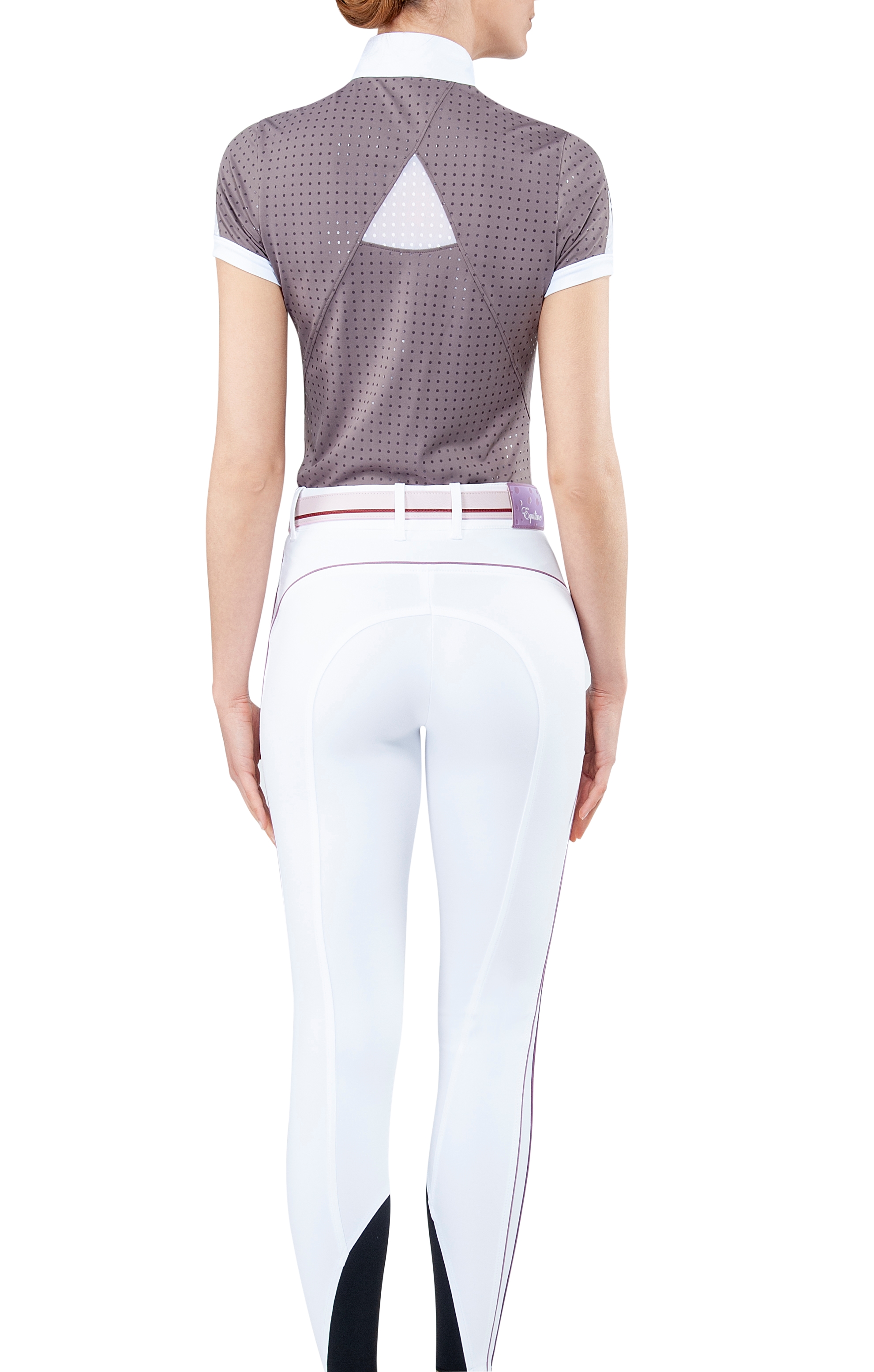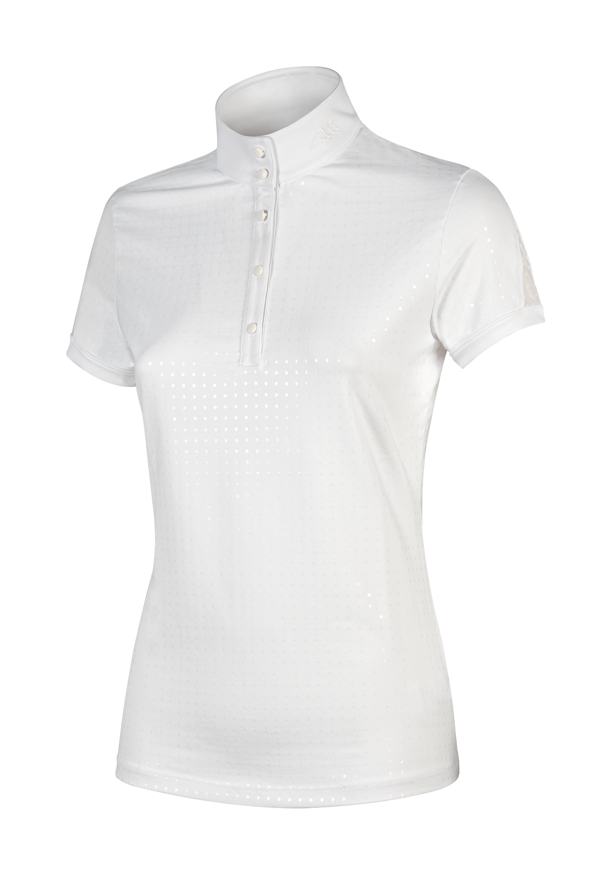 Equiline Ebony women's competition polo shirt SS2020. Equiline Ebony er en virkelig smart og behagelig stævnebluse fra Equilines SS2020 kollektion. Denne stævnebluse er i et yderst behageligt teknologisk materiale - velsiddende og svedtransporterende. Ebony har mange fine detaljer - ud over at materialet er med tone-i-tone prikker, så har denne stævnebluse mesh materiale i ryg og ærmer, og ærmerne har en blød elastisk ribkant. Knapper foran. Stævneblusen har hvid krave, men i farven Sparrow kan den også nemt anvendes til hverdagsbrug eller når man for eksempel skal ride undervisning eller kursus. En flot klassisk stævnebluse.