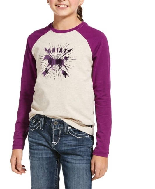 Hvis der er en ung rytter som kan lide lidt glitter, så er denne langærmede t-shirt fra Ariat nok et populært hit! Et splash af et logo der er blankt og glitrer - Ariat Dash Logo t-shirt er en del af AW2020 kollektionen. Disse t-shirts fra Ariat er altid populære. Bløde og lækre og med gode friske farver! Se str på billede nr. 2