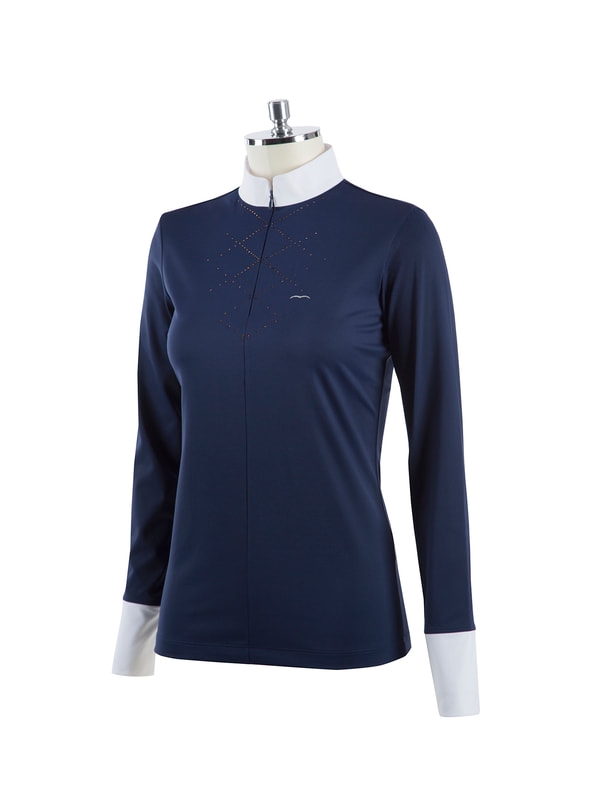 Animo Baob womans long sleeves competition polo FW20. Animo KAN bare det der med at lave virkelig flotte stilfulde ridebluser i det mest behagelige materiale og med de fineste detaljer. Denne lækre bluse er ingen undtagelse. Den er selvfølgelig oplagt som stævnebluse, men vi ser også mere og mere at rytterne ønsker nogle flotte unikke bluser at ride med til undervisning og træning. Denne er flot alene men kan selvfølgelig også bruges under en v-neck trøje eller en vest. Den flotte navy farve er krydret med smukke sten i brunlige/kobber nuancer. Animo logo ved brystet. Animo er italiensk og størrelserne er små- vi anbefaler at vælge 2 størrelser større end du normalt ville bruge.