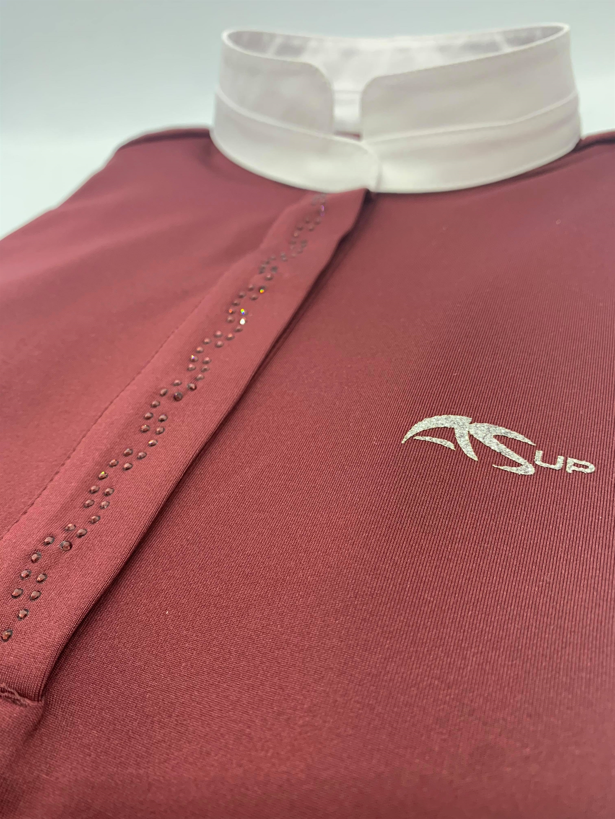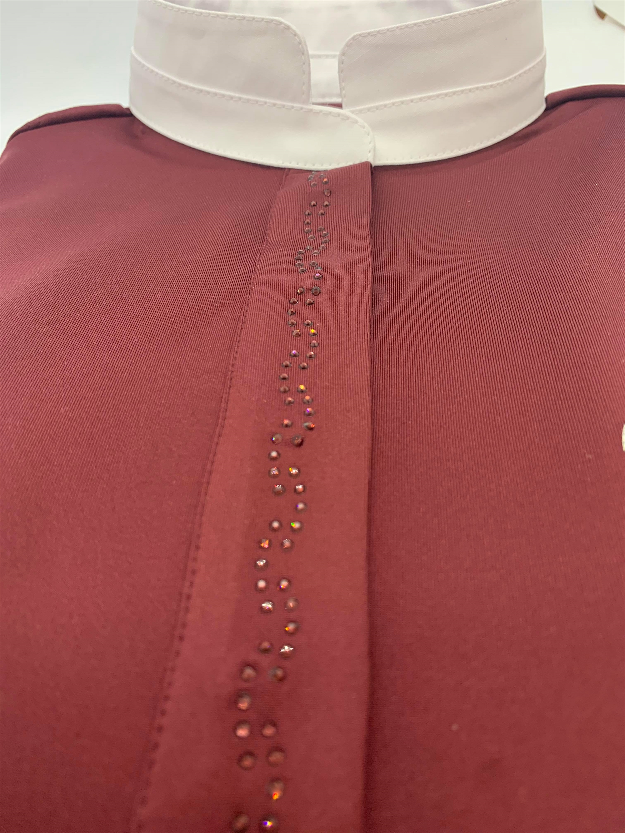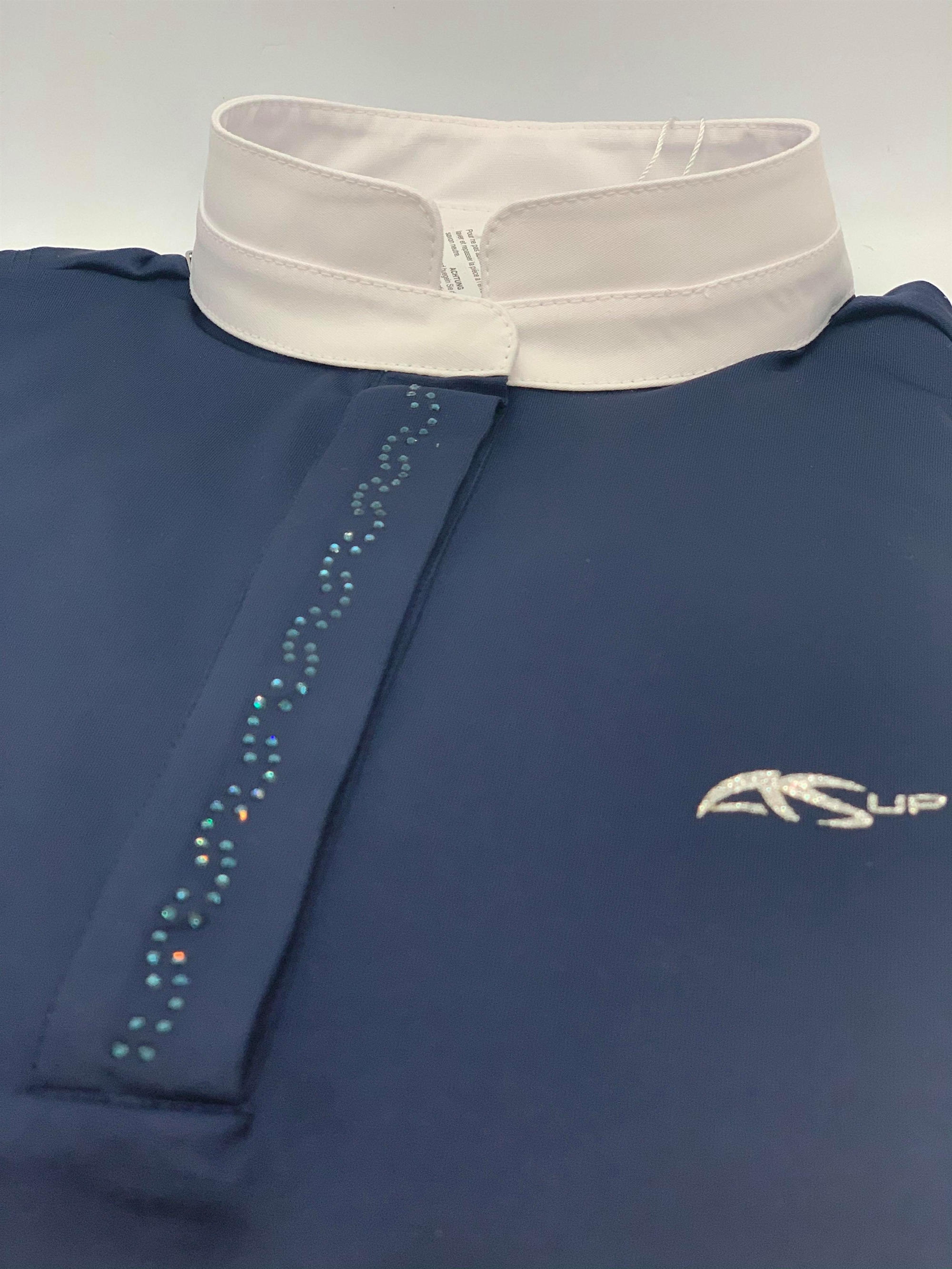Anna Scarpati er italiensk design og kvalitet med årelange traditioner. Deres materialer er super behagelige og denne stævnebluse/ridebluse Frine er ingen undtagelse. Blusen har en flot behagelig hvid krave og er i et lækkert blødt og åndbart teknologisk materiale. Trykknapper foran flot skjult af en fin lukning udsmykket med et diskret men elegant tone-i-tone swarovski mønster. Denne bluse er langærmet. Super behagelig at have på- mon ikke den vil blive brugt både til stævner samt for eksempel til kursus eller undervisning?