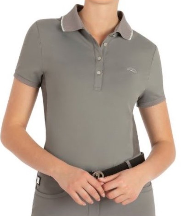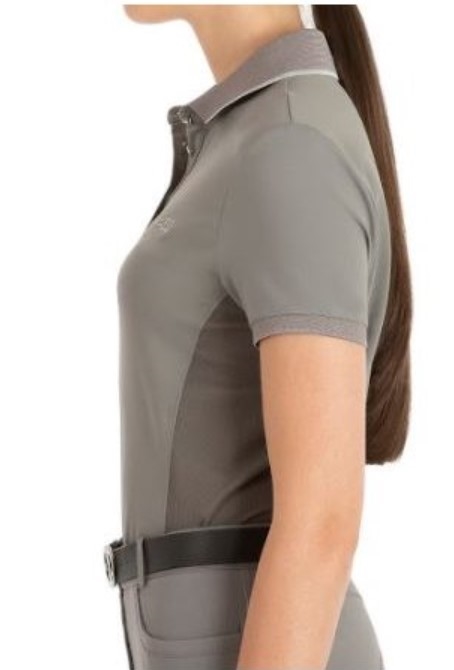 Equline Ellae Polo i frost grey- en super lækker polo i et åndbart og let materiale. Mesh i siden under armene som sikrer optimal åndbarhed. En lille kant på kraven i sølv lige som Equiline logo ved venstre bryst er i sølv.