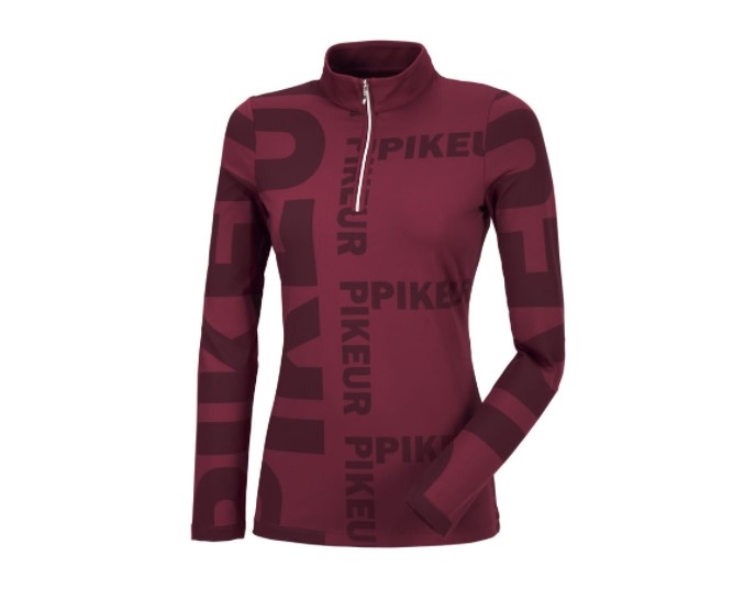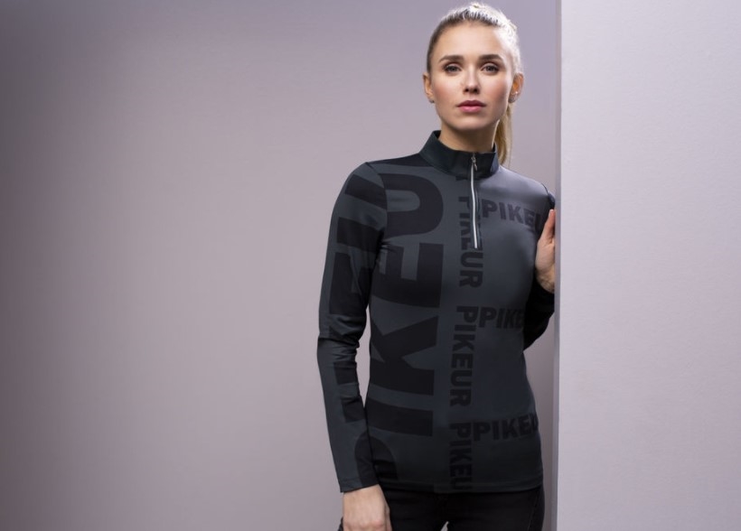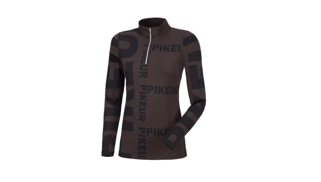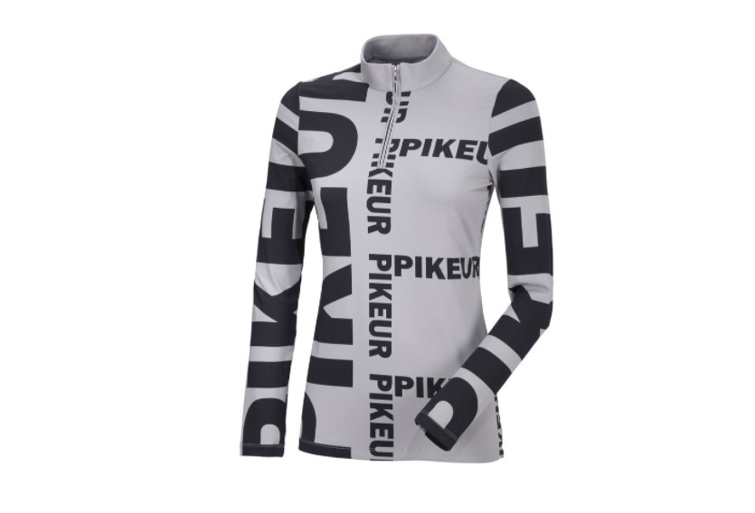 Super lækker ridebluse med lynlås i halsen. Virkelig lækkert teknologisk materiale og ret så funky med Pikeur skrift/logo i forskellige størrelser på blusen. Velsiddende og fungerer som baselayer samt alene eventuelt med en ridevest udenpå, når vejret bliver køligere. Men ellers er den også fin bare i sig selv som langærmet funktionsbluse/t-shirt. Materialet er blødt, velsiddende og svedtransporterende.