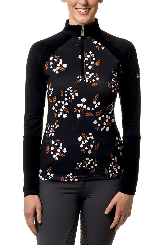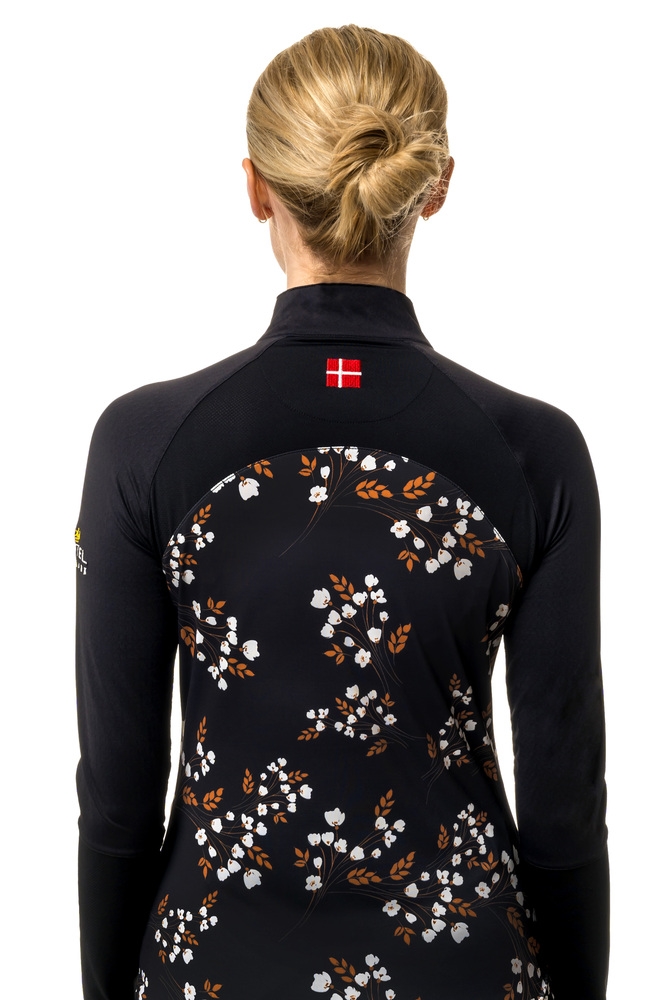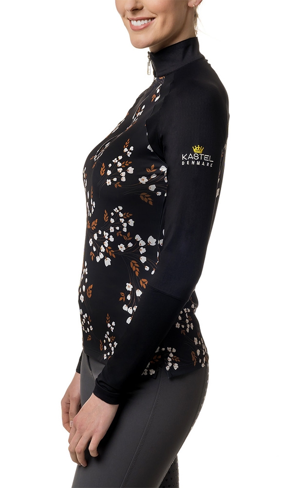 De nye designs fra Kastel er lige så behagelige som de plejer at være, men print og farver er helt i særklasse i år! AW21 kollektionen byder blandt andet på dette skønne blomsterprint i hvide og rust orange nuancer på sort baggrund. En super smuk bluse som samtidig lever op til rytternes krav om funktionalitet. Kastel bluserne er velsiddende, åndbar, bløde og lette. Der er 1/4 lynlås og materialet reducerer evt lugtgener så som sved. Mesh materiale ved kraveben og bagpå skulderpartiet sikrer endnu bedre åndbarhed. Ærmet afsluttes med elastisk manchet, som sætter prikker over i'et i forhold til hvor flot blusen her sidder. Kastel er kendt for at have UPF beskyttelse i materialet, og denne bluse er ingen undtagelse og har UPF 30+ som beskyttelse.