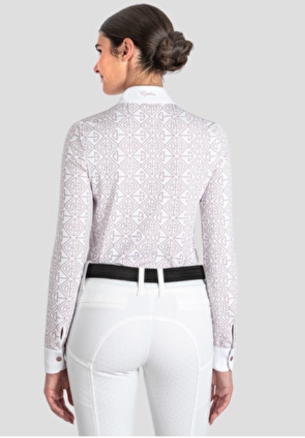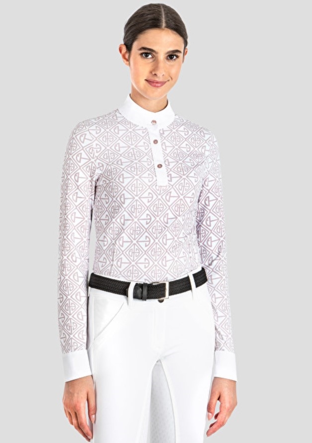 Equiline Competition Polo Malva - en rigtig fin langærmet ridebluse til hverdag og fest. Lækkert teknisk materiale og super pasform, hvilket er noget som kendetegner Equiline generelt. Italiensk design og komfort - denne er hvid med fint pudderfarvet/rosa mynster lige som knapperne er i pudderfarvet perlemor. Equiline er italiensk og et mærke som de professionelle ryttere er meget glade for. Størrelserne er små, så vælg 1-2 størrelser større end du plejer.