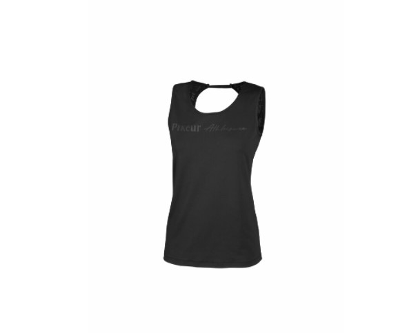 Pikeur Omal Athleisure top med åben ryg - teknisk materiale som er virkelig behageligt at have på hvadenten det er til en ridetur på banen i varmt vejr eller måske endda til rytterfitness? Perforeret mønster i ryg giver ekstra god udluftning og åndbarhed. Toppen er sort.