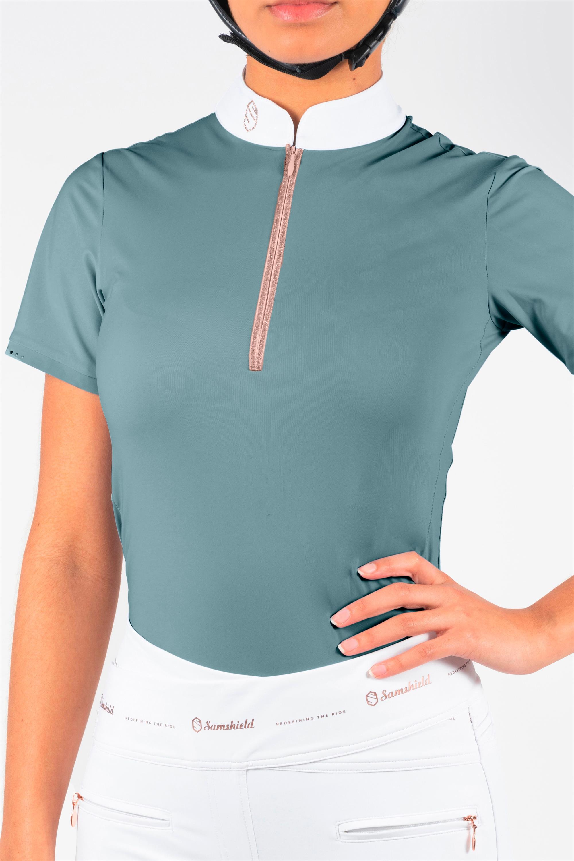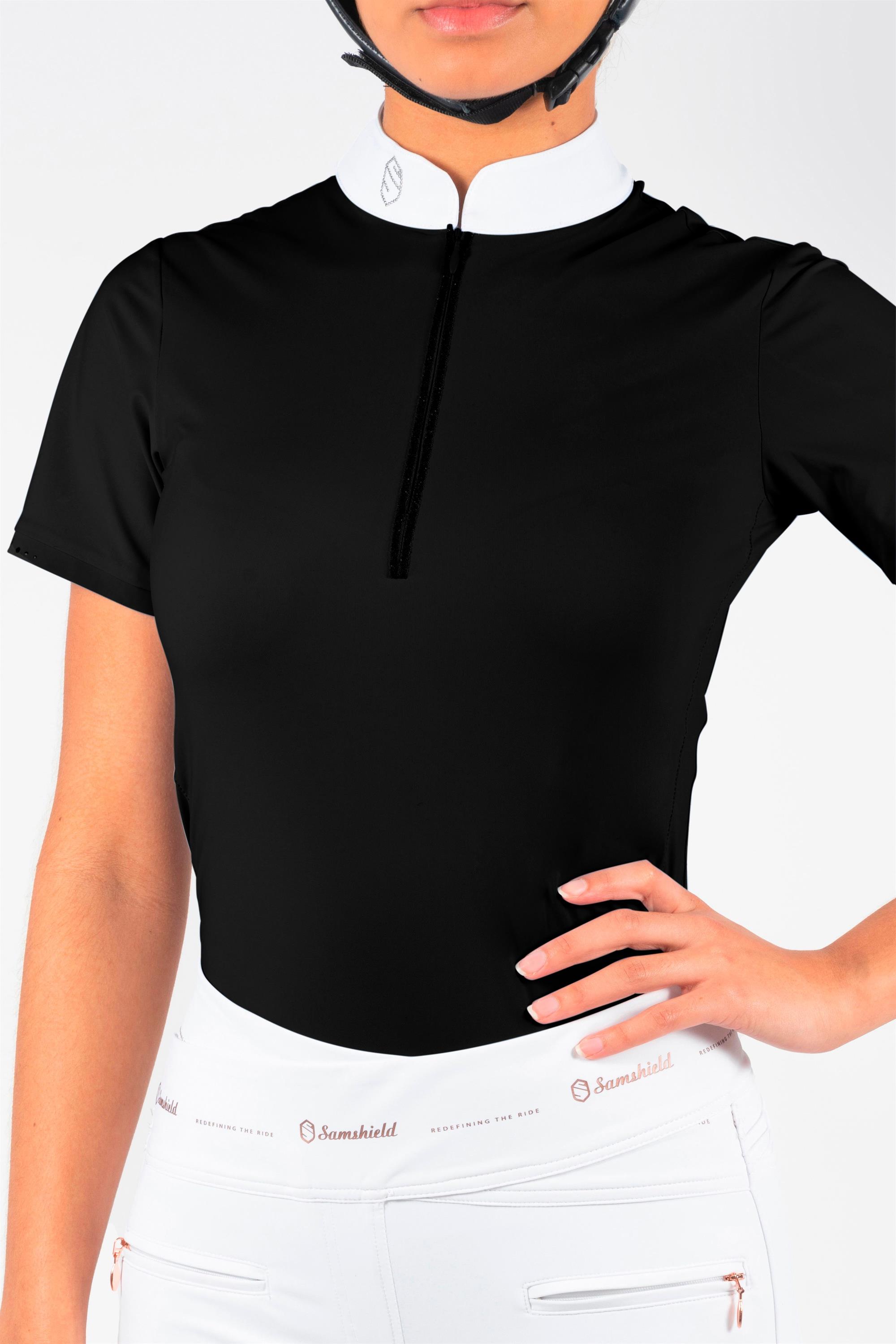 Samshield Aloise er en af vores bestsellere fra Samshield år efter år. Denne stævnebluse er et "musthave" i stævnegarderoben. Samshield Aloise er en super lækker og luksuiøs bluse med swarovski detaljer og Samshields populære Swarovski Crystal Fabric detaljer. Samshield Aloise er fremstillet i det lækreste tekniske materiale, så den er åndbar, hurtigtørrende og stretchy. En bluse der holder dig både tør, behageligt til mode samt stilfuld på een gang, når du skal ride stævne. Der er dog mange der bruger den til ridning også i hverdagen og for eksempel til undervisning og kurser, da den er super behagelig at have på og samtidig giver et pift til dagens outfit. Samshield Aloise har smukke Swarovski detaljer, som gør denne bluse ekstra elegant og sofistikeret. Super fine detaljer med crystal fabric foran og Swarovksi logo på kraven og finde detaljer bagpå. Aloise er udsmykket smukt og unikt med Holographic Swarovski Crystal Fabric detaljer og små metal nitter samt Swarovski logo på kraven. Nok den mest stiflfulde funktionsbluse man kan finde.