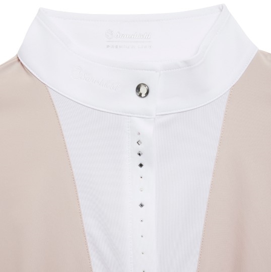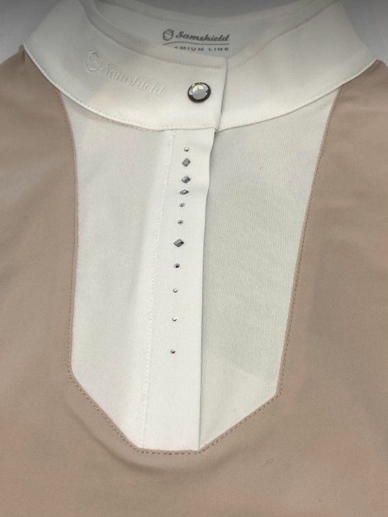Samshield Apollina Crystal er efterhånden en klassiker iblandt Samshields stævnebluser. Hvert år med en lille ny ændring i udtrykket men altid samme super pasform og mega lækre tekniske materiale. I år er udskykningen smuk og enkel. Blusen lukkes i kraven med en smuk krystalknap. Foran er er "dråber" i forskellige størrelser af smukke swarovskisten. Under den lille åbning bagpå ses en enkel swarovksi. Broderet Samshield logo på kraven.
