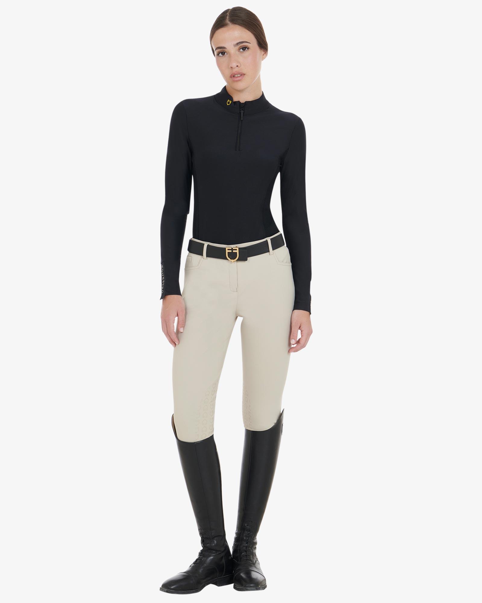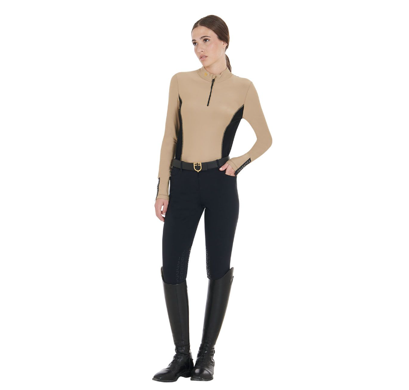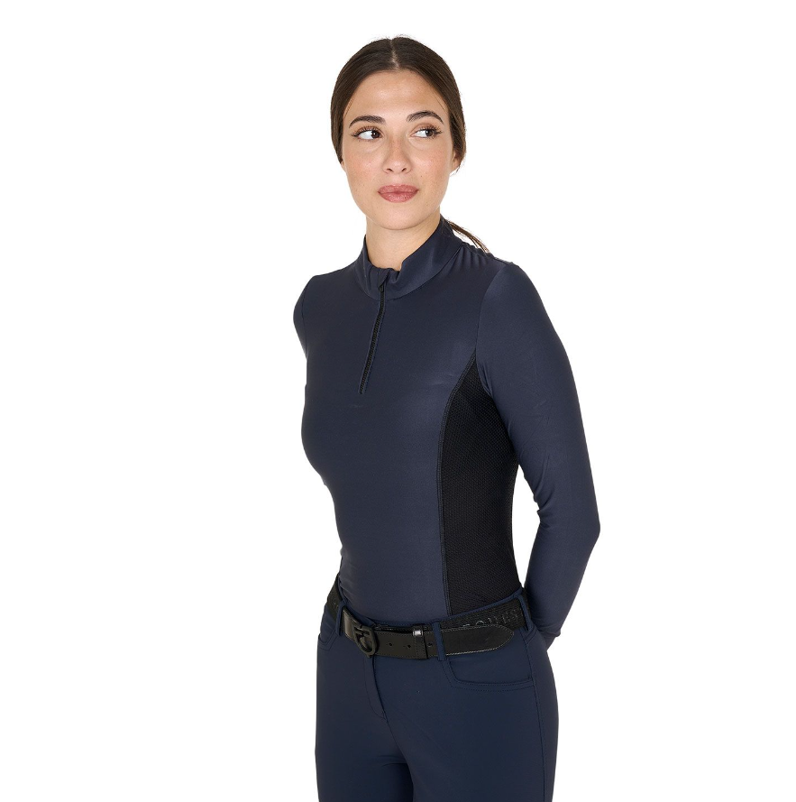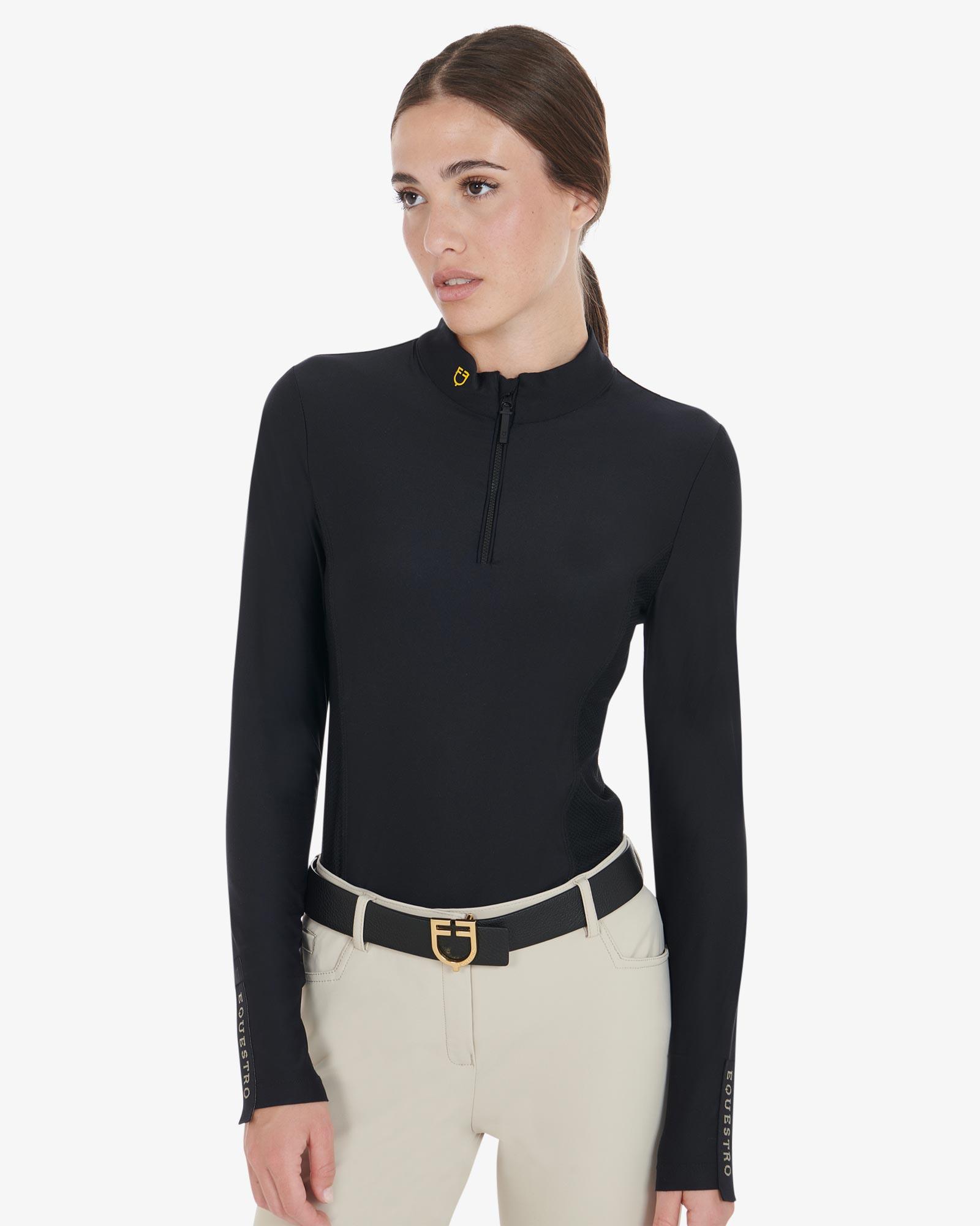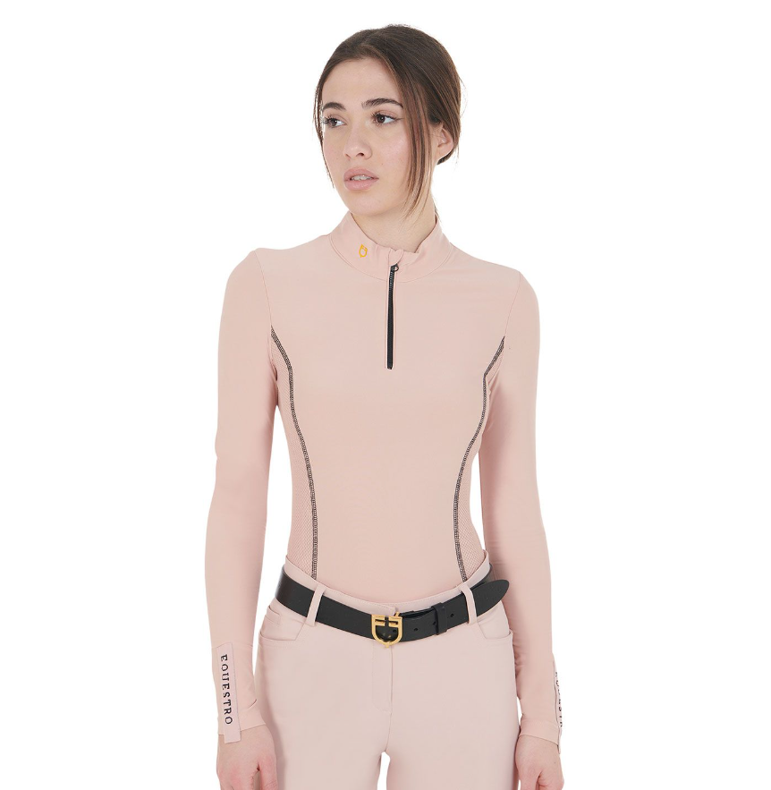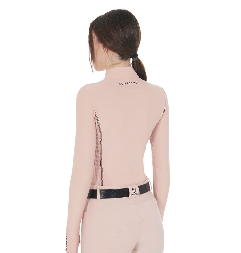 Equestro langærmet baselayer træningspolo i teknisk, åndbart og elastisk materiale til damer. En elegant, sporty og yderst komfortabel træningsbluse, der båder hiver point hjem på bevægelighed og look. Materialet giver trøjet et perfekt fit og har antibakterielle egenskaber, så den er optimal til dagligdagens træning, og de subtile detaljer med Equestros logo fuldender stilen for denne gennemførte polo baselayer.