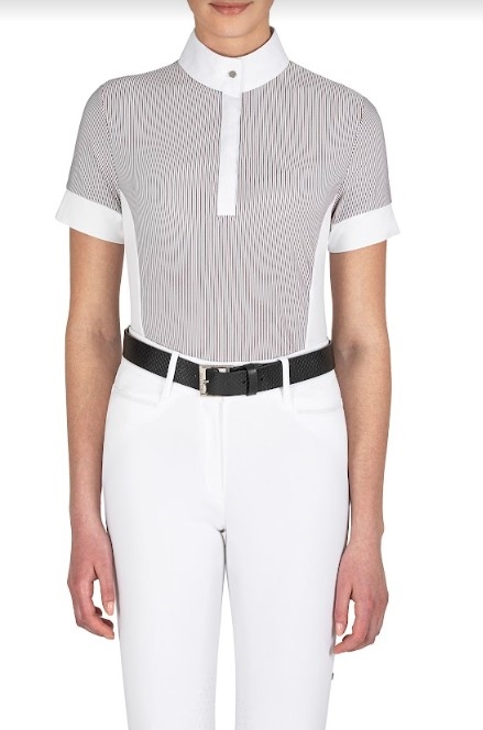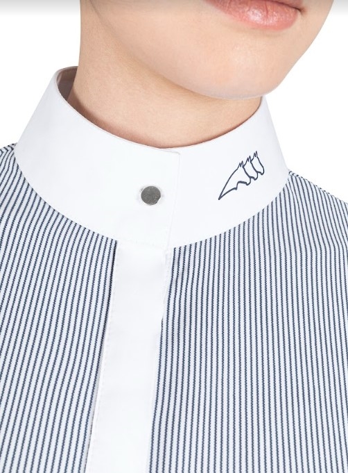 Equiline Womens competition polo Eliciae. Denne super lækre og behagelige stævnebluse fra italienske Equiline er virkelig klassisk og flot. Equilines stævnebluser er noget undervurderede på det danske marked - de fortjener meget mere opmærksomhed, da Equiline laver stævnebluser du ikke har lyst til at tage af! Materialet er let, hurtigtørrende og åndbart. Det er yderst stretchy og tilbyder derfor rytteren optimal bevægelsesfrihed. Denne polo har oprejst hvid krave og stolpelukning med trykknapper. Den øverste knap er synlig. Lækkert skjortelook men super behagelig og helt optimal til den travle stævnedag!
