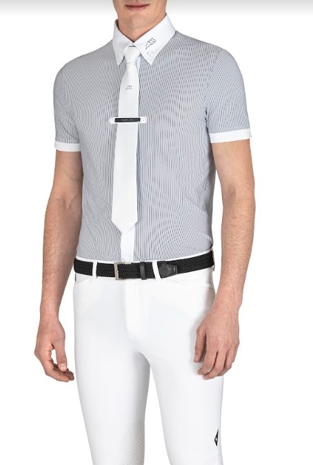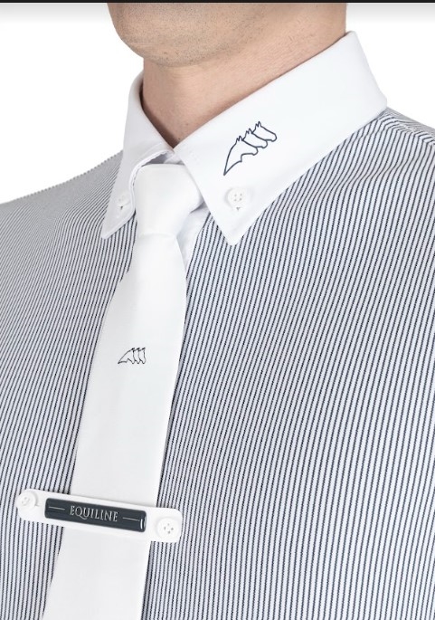 Meget lækker stævnebluse til ham - Equiline fremstiller stævnebluser i det lækreste og mest behagelig materiale. Denne har look som nålestribet skjorte! Mega klassisk. Hvid med mørke navy striber. Slips medfølger ikke.