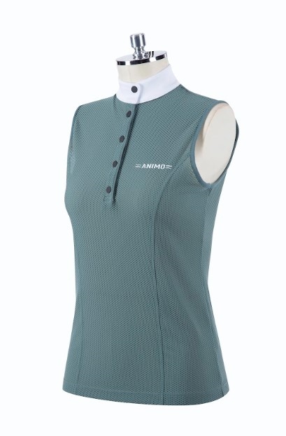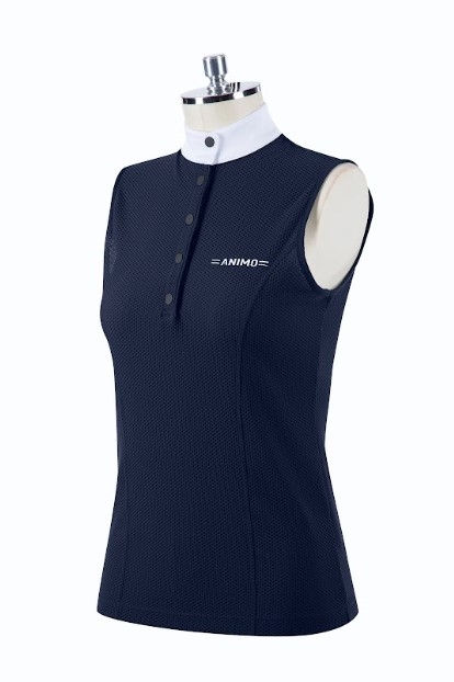 Animo Bastill er en ærmeløs ridebluse med hvid krave og i det lækreste luftige materiale. Animos nye "sommermateriale" er behageligt og åndbart. Blusen kan bruges under stævnejakken, da den er med hvid krave- men samtidig fungerer den også som en fin træningsbluse, hvis man har mere brug for det.