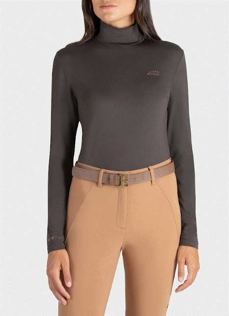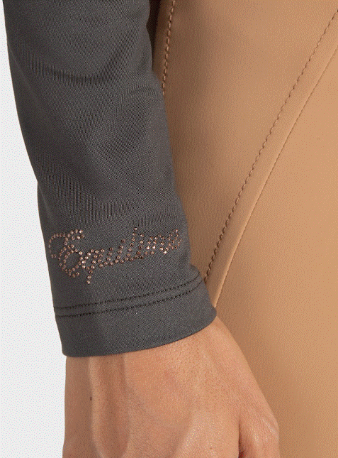 En klassiker og bestseller fra italienske Equiline: Equiline Ebrande second skin ridebluse med lange ærmer og hals. Materialet kaldes "second skin", fordi det føles så blødt og behageligt på, at det nærmest vil gå i eet med din hud. Indersiden er børstet fleece så selvom blusen er tynd, let og behagelig, så er den lun på kolde dage. En perfekt bluse til kølige dage også til lag-på-lag påklædning. Farven Liquorice er en mørkebrun farve som har logo i brune sten, og den navy har også brune sten i logo. Logo ved venstre bryst samt højre ærme.
