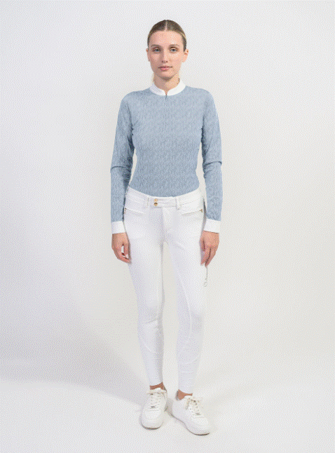 Samshield Louisella ridebluse i light blue leaf er en både sporty og smuk bluse, som kan bruges til stævne eller til hverdag, hvor den vil være stilfuld med en vest ud over. Louisella light blue leaf er på en og samme tid yderst stilfuld og praktisk. Louisella er både let og behagelig at have på samtidig med at den oser af stil. Louisella har smukke detaljer og usynling lynlås. En bluse der vil falde i god jord hos ryttere som går op i funktionalitet og tidsløs elegance.