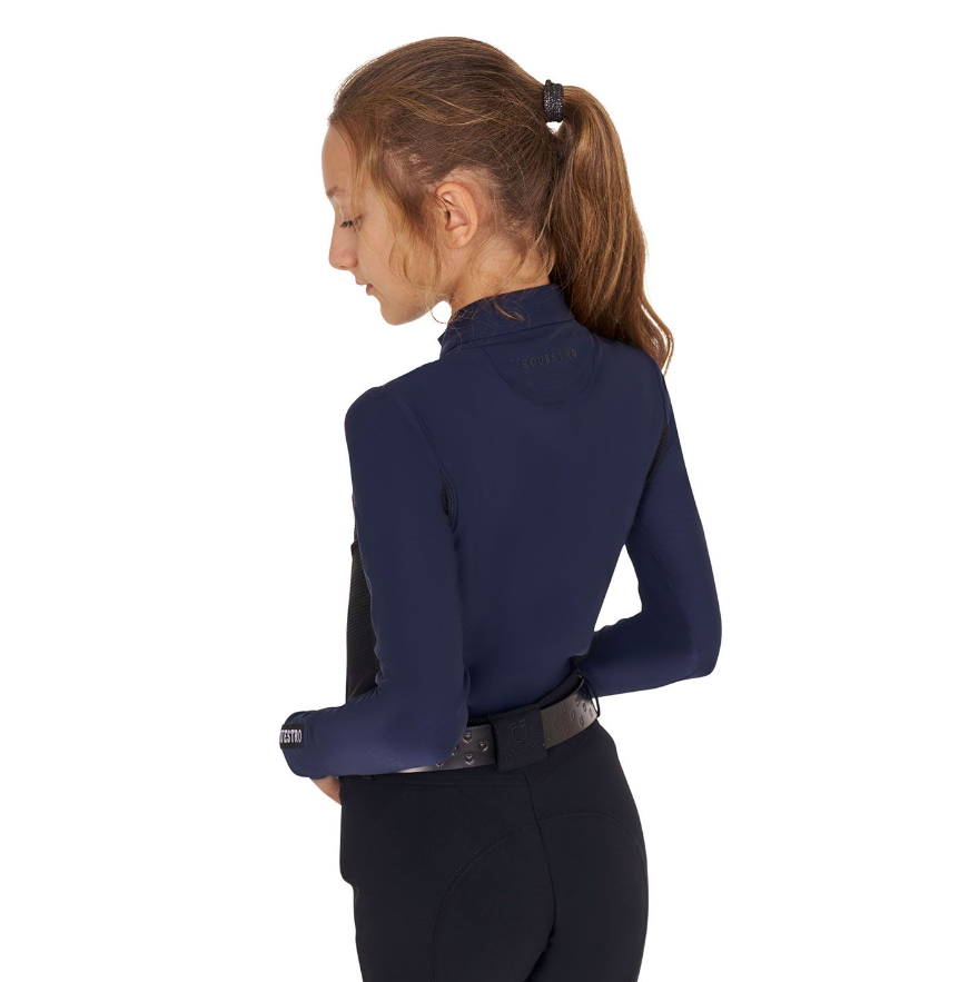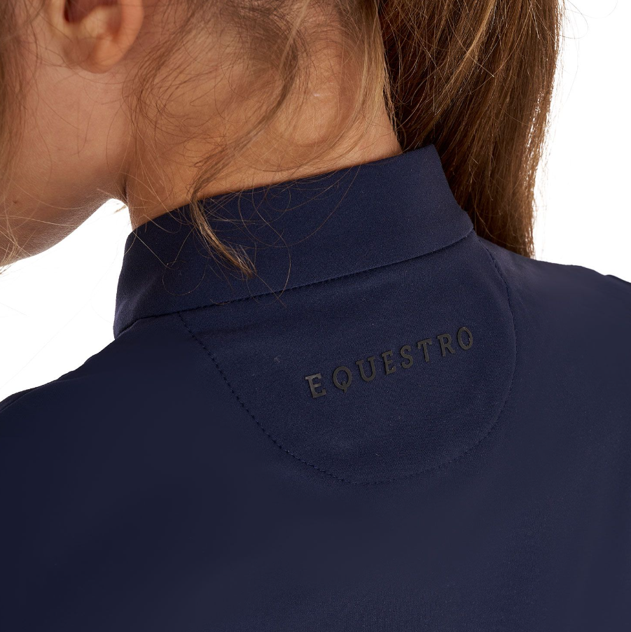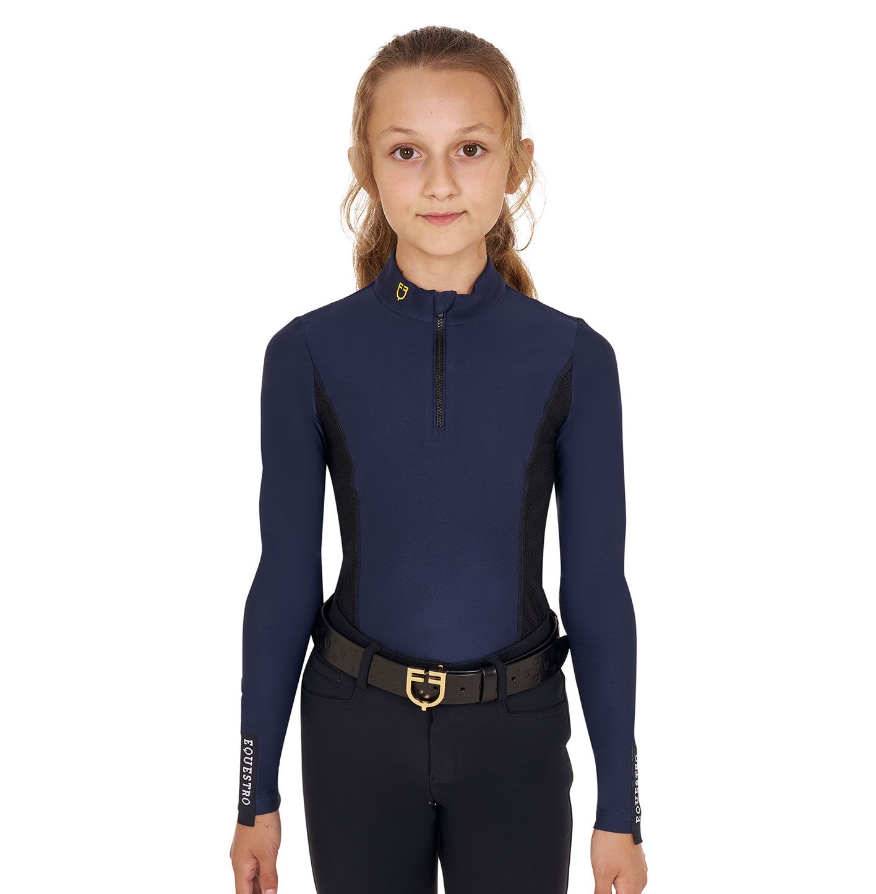 Equestro er italiensk og et mærke som fokuserer på brugen af lækre materialer og beklædning, som der sidder super godt uden at koste en formue. Denne baselayer træningsbluse til piger er en klassiker fra Equestro og en behagelig følgesvend det meste af året i et land som Danmark.
