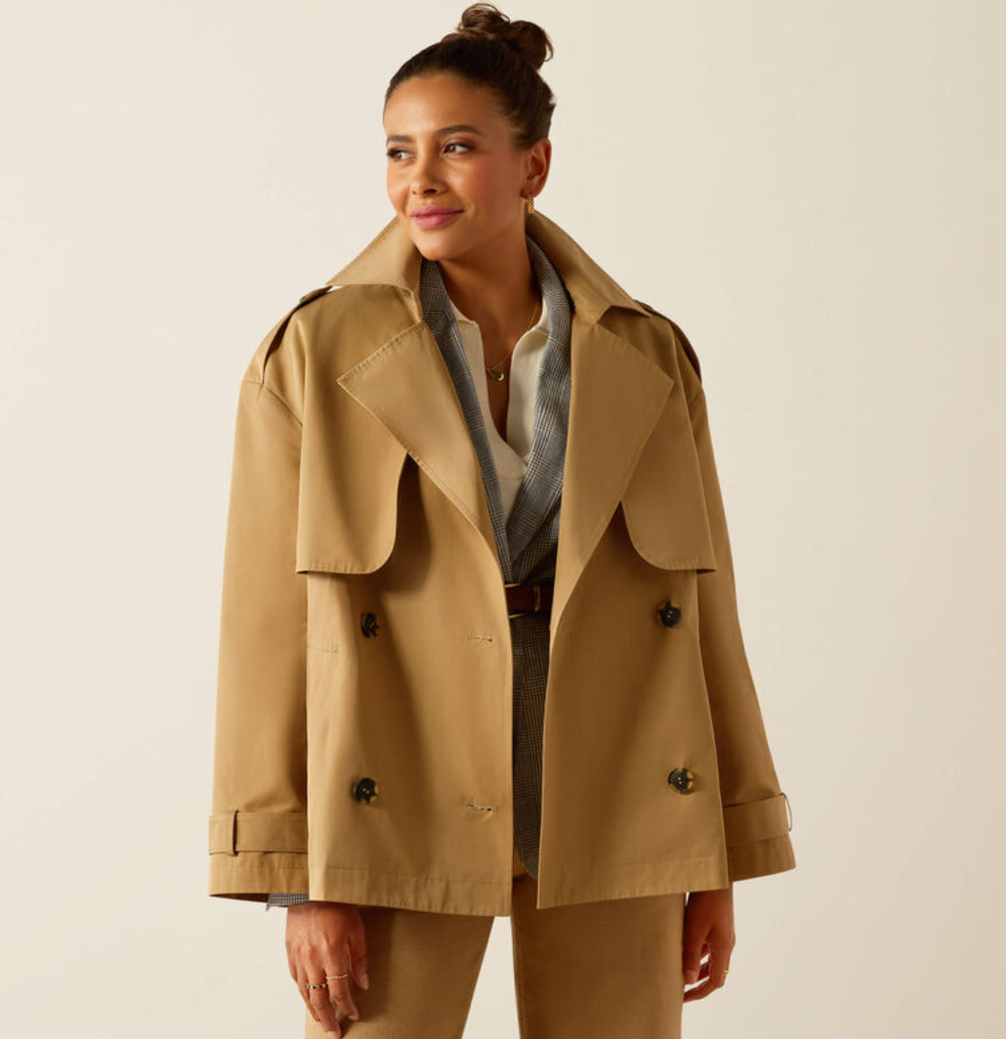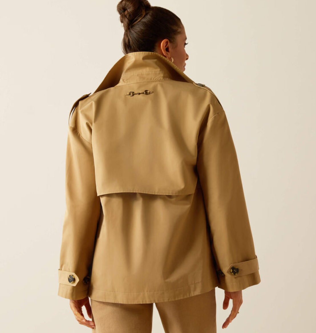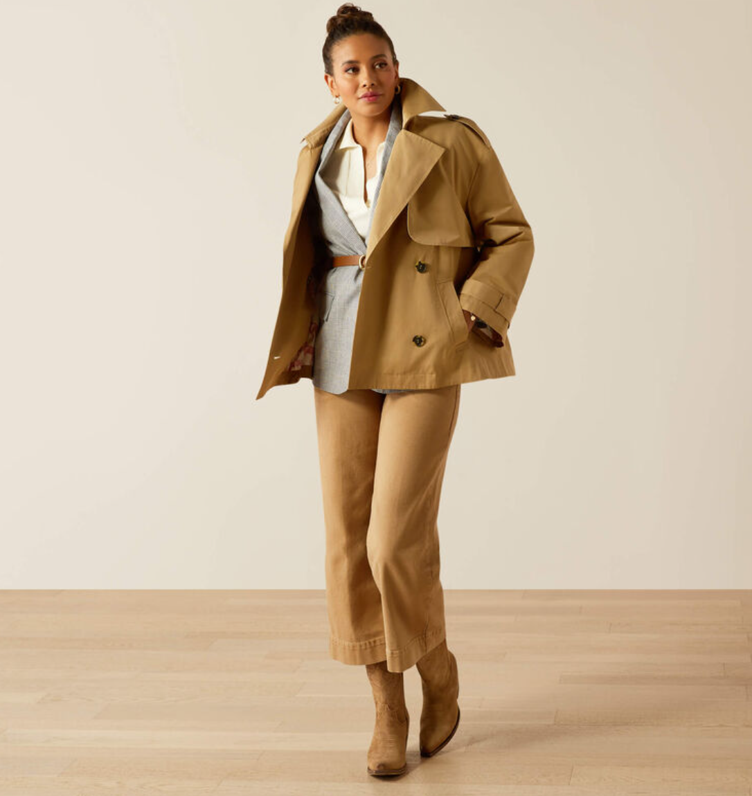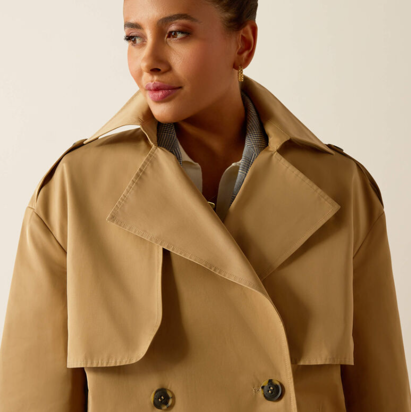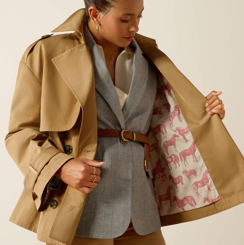 Med den stilfulde A-facon og korte længde har denne trenchcoat agtige jakke virkelig blikfang! Ariat Staunton jakken er kort og rummelig i sin facon på en virkelig moderigtig måde, hvilket understreges af ærmer med bredde. En moderne udgave af den klassiske trenchcoat. Jakken er spækket med smukke detaljer som toppes af inderforet med heste på. En jakke som er virkelig stilfuld og klassisk og med et lille strejf af heste, dog uden at være en ridejakke. Dette er en jakke til byturen eller slentreturen eller en weekendtur med kæresten.