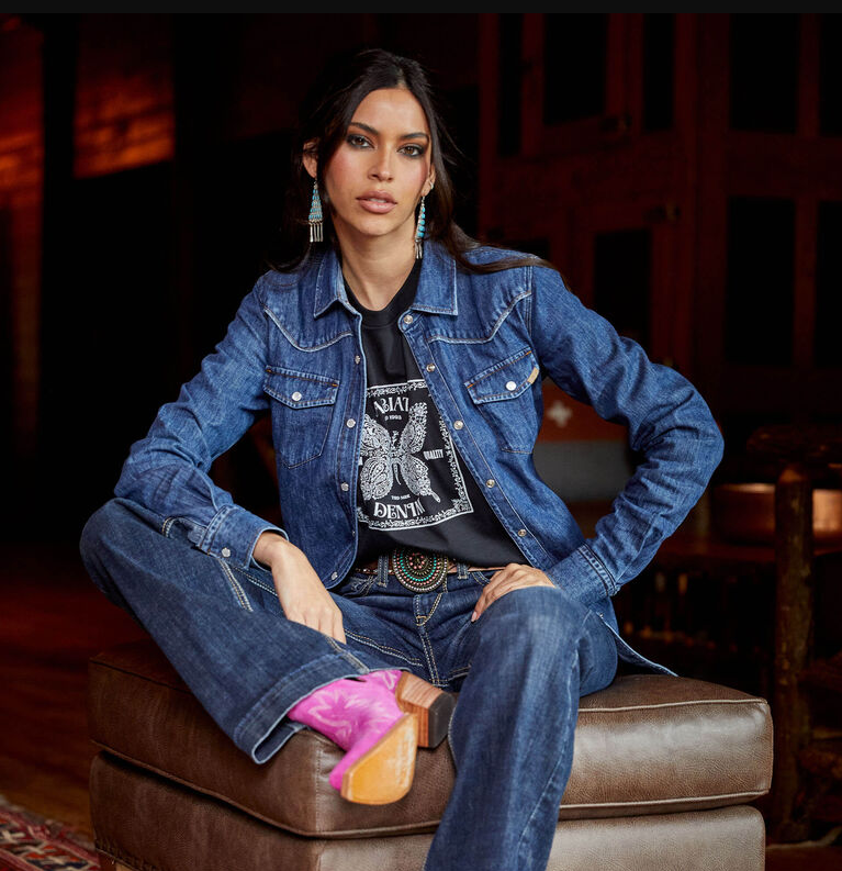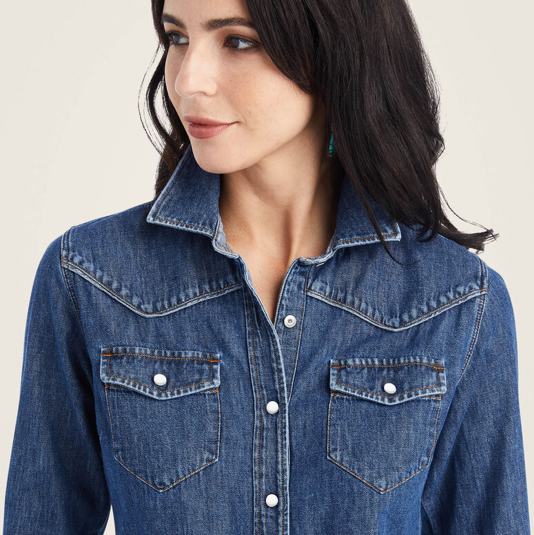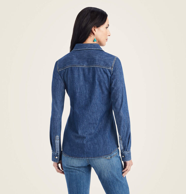 Hvis ikke hestepiger skulle gå i denim skjorter, hvem så? Men når det så er sagt, så er denne lækre denim skjorte anvendelig i alle sammenhænge. Den er fin både uden på bukserne eller nederdelen - eller nede i bukserne med et lækkert bælte til. Man behøver ikke ride rodeo for at bruge denne skjorte- men det hjælper! Skjorten er faconsyet og derfror også ret klassisk og stilfuld.
