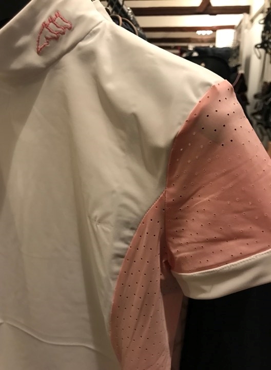 Equiline Cabala stævnebluse til piger er en meget feminin bluse til den unge rytter. Det karakteristiske Equiline logo med de tre hestehoveder er på kraven, og de korte ærmer samt siden af blusen er perforeret lyserød i åndbart materiale.