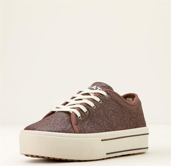 Ariat Skylar trainer sneakers i farven brown floral emboss. En behagelig og let sko i lækkert look. Som alt Ariats fodtøj, så får du her en sporty og lækker sko med unik komfort. Indersålen er meget affjedrende og inderfor er i åndbart mesh materiale. Mellemsålen er Ariats FLX Foam™ midsole, som giver en let og fjedrende følelse hvert skridt man tager. Ydersålen er Duratread™ sål som gør skoen meget solid og holdbar. Ud over sålen, så er resten af skoen udvendigt fremstillet af præget læder.Sålen er med en smule platou i højden, så selvom den hedder "trainer" så er dette nok mere en god sporty hverdagssko, som kan peppe de fleste outfits up!