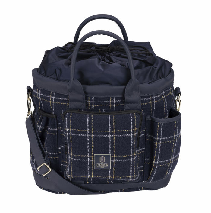 Den klassiske strigletaske med skulderstrop og hank fra Eskadrons Heritage kollektion. Materialet er helt mørk navy Boucle i super klassisk look med imiterede læderdetaljer også i bunden, så den tåler at stå på staldgangen. Kan rumme både strigler og dunke med showshine mme. Gode yderrum hvoraf det ene er med lynlås.