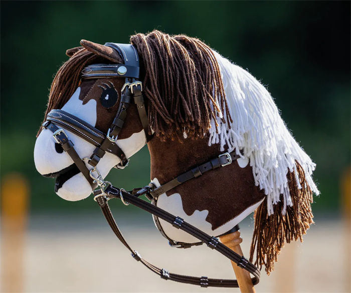 Til kæphesten: Super fint hovedtøj med tøjler i brun syntetisk læder og med dekorative syninger. Vil passe godt på alle kæpheste! Trensen her ligner og føles som rigtig læder.