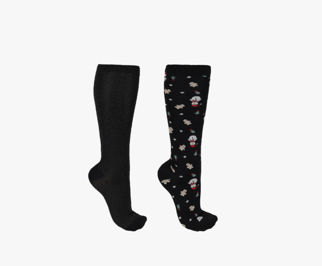 Æske med to par ridestrømper "Snowman" hvor det ene par er sorte med glitter og det andet er med snemænd, juletræer og gingerbread mand!