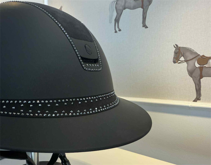 Samshields V2 Miss Shield shadowmatt sort med top i sort alcantara og frontbånd med Tiara. Blazon er matt sort og så er der ekstra swarovski både 5 stk på blazon samt hele 300 glitrende sten lagt ind i den mørke trim. En virkelig smuk og klassisk hjelm. Denne hjelm er med dressur cut bagtil, så der er god plads til håret.